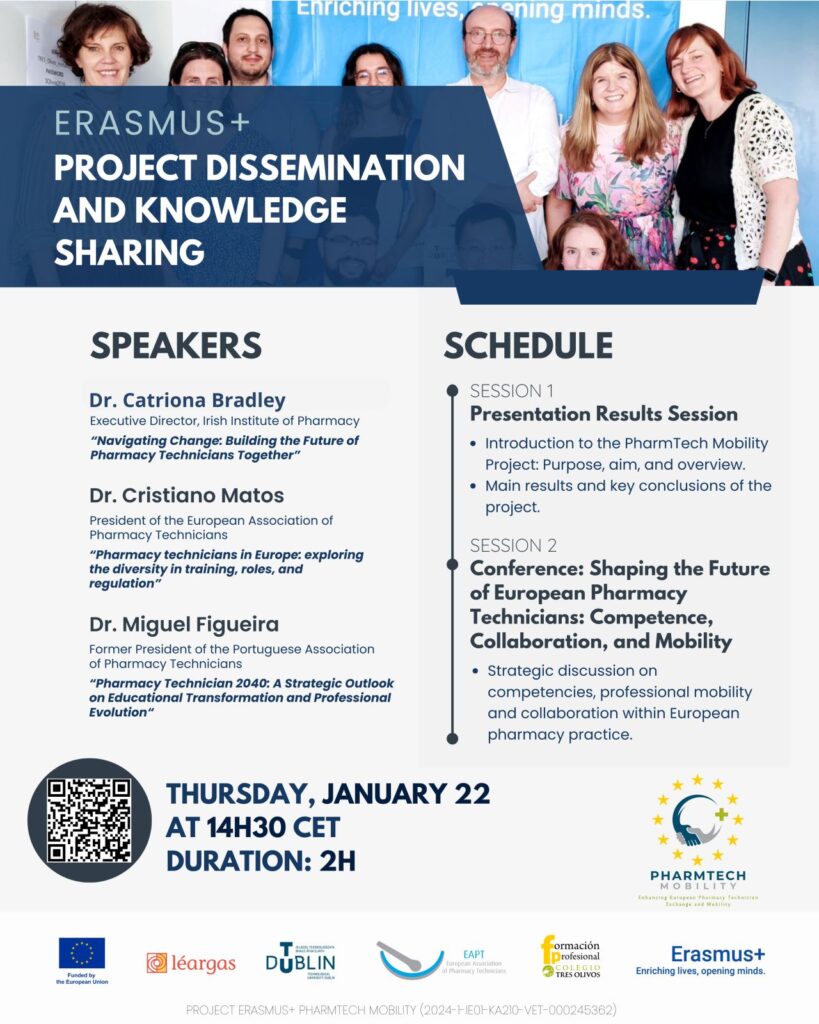 Los resultados del proyecto se publicarán en formato de libro y otras publicaciones, sirviendo como guía para fortalecer la formación, la movilidad y el reconocimiento profesional de los técnicos de farmacia en Europa. Estamos comprometidos con Formación Profesional y convencidos de la importancia de seguir trabajando en la construcción de la identidad europea de nuestro comunidad educativa.